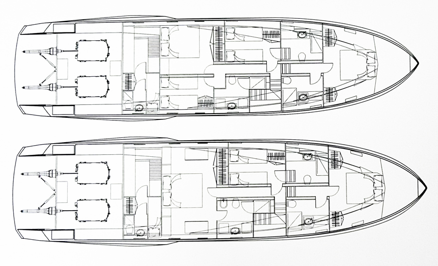 Il lay-out degli interni, prevede due soluzioni, a tre o a quattro cabine. Il design ha una matrice chiaramente minimalista; l’obiettivo, è stato quello di sviluppare un progetto che fosse rigoroso, minimale, ma comunque