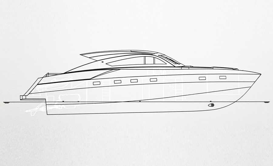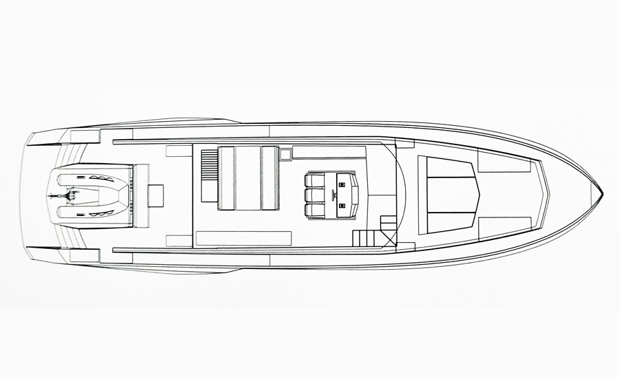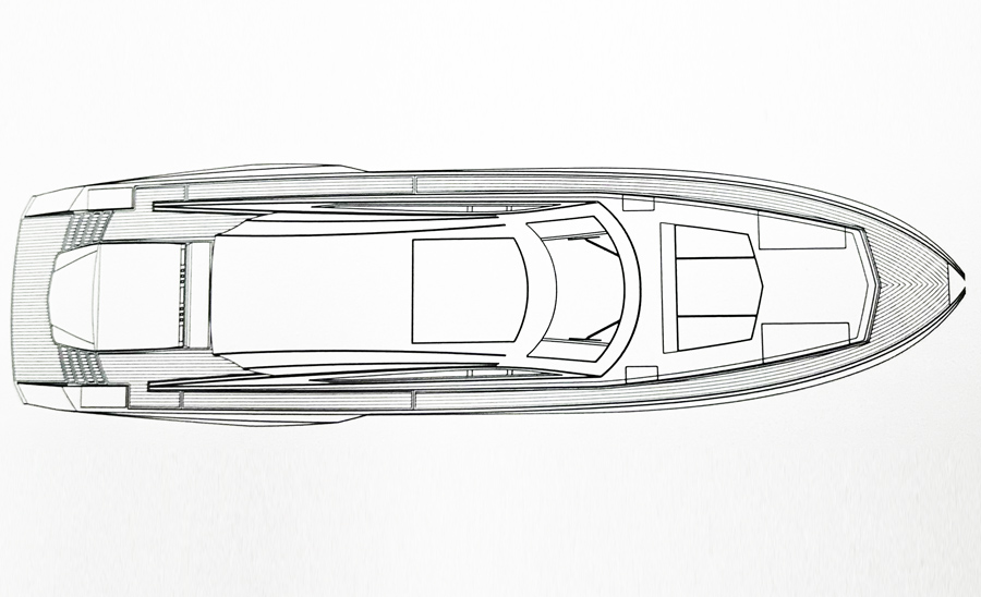 La poppa, presenta una particolare soluzione che prevede la plancetta da bagno, integrata nel volume di poppa, in modo da non alterare il profilo laterale dell’imbarcazione.